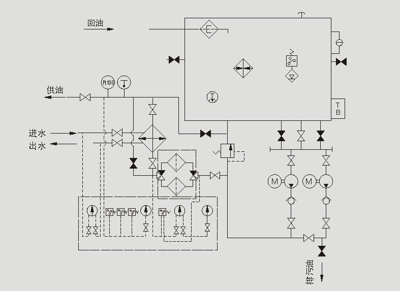 油箱装有电接点温度计,根据供油温度要求,调定最高和最低两个界限。在低温时,信号灯亮,人工开启加热器进行加热;当油温升至高点时,自动切断加热器,停止加热;且控制油温过低时,油泵不能启动;供油口装有铂热电阻,当供油口温度高时,报警并开冷却器;冷却器设有旁路直通管道,当不用冷却器或它需检修时,可关闭进出油口阀门,同时打开旁路阀门,让油经由直通管道输出或卸下冷却器进行维修,而不影响稀油站工作。